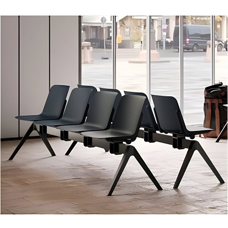 Bien que la chaise à quatre pieds sans accoudoirs intègre une pièce de liaison intégrée, la version avec accoudoirs a une pièce de liaison entre les cadres fixes, réalisée avec une plaque en acier