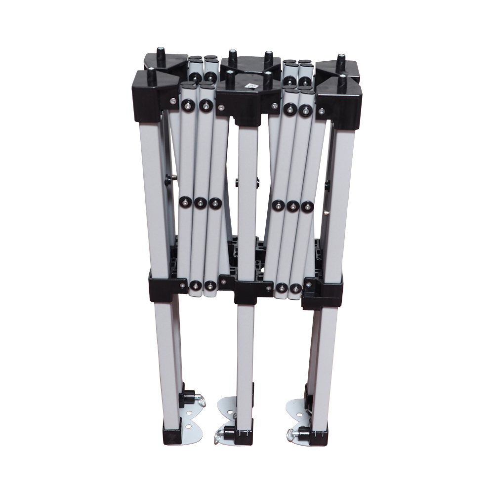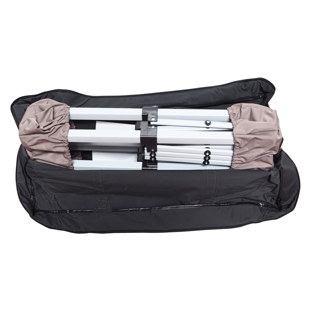 Bar pliant équipé d’une bâche noire en polyester 200gr enduit PU qui se fixe sur la structure par un système de scratch (femelle sur le stand et mâle sur la jupe) avec 4 scratchs pour fixer la bâche au piétement et couvre le devant et les 2 cotés
