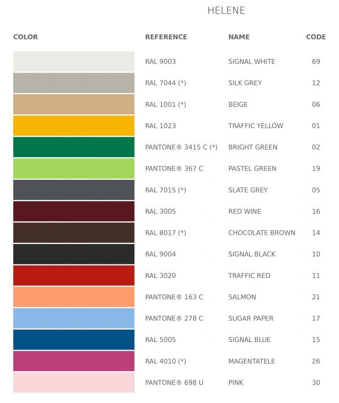 | Coloris | Beige RAL 1001(*), Blanc RAL 9003, Bleu foncé RAL 5005, Bleu Pastel PANTONE® 278C, Bordeaux RAL 3005, Gris Ardoise RAL 7015(*), Gris Soie RAL 7044 (*), Jaune RAL 1023, Magenta RAL 4010(*), Marron RAL 8017(*), Noir RAL 9004, Rose PANTONE® 698U, Rouge RAL 3020, Saumon PANTONE® 163C, Vert Foncé PANTONE® 3415 C (*), Vert Pastel PANTONE® 367C |