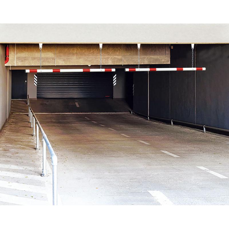 Un limiteur de hauteur pour les véhicules hors gabarits (caravane, mobile home…) simple et efficace, sous forme de barre acier rouge et blanc à suspendre.